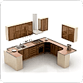 Г-образная планировка подходит для просторных помещений. Расположив рабочую зону вдоль двух перпендикулярных стен, вы сможете добиться максимальной свободы в размещении других предметов мебели.